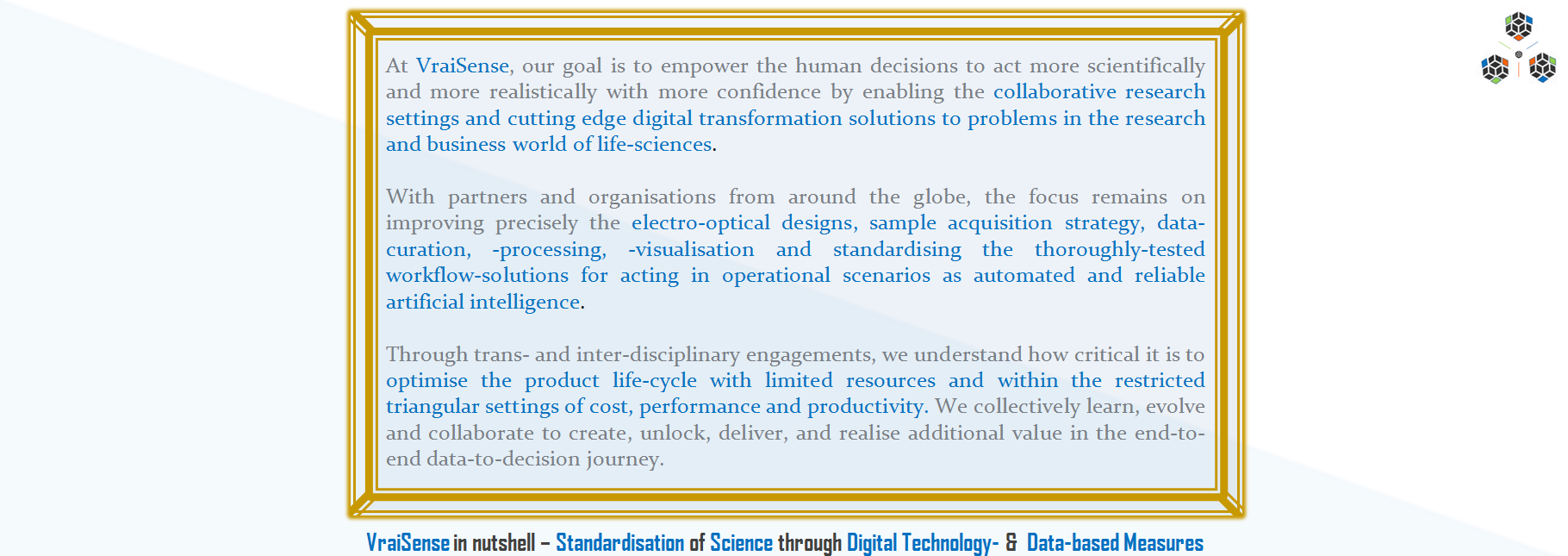 At Vraisense our aim is enabling our partners while diagnosting to have minimal invasion to life for observing the allied altered-phenomenon, improving the safety standards. Collaborating for improving the diagnosis approaches and scanning processes that enable better options for humans to opt for. Ensuring high standards of diagnostic processes for better human health, with more comprehensive and innovative strategies in place. To comply with the ethics-oriented regulations and minimising the adversarial-effects and thresholds of invasion. To achieve the optimal exposure, diagnosis and control settings, ensuring more safer options for healthcare professionals. The challenges are with the specificity and preciseness. And hence the role of allied collective innovations.